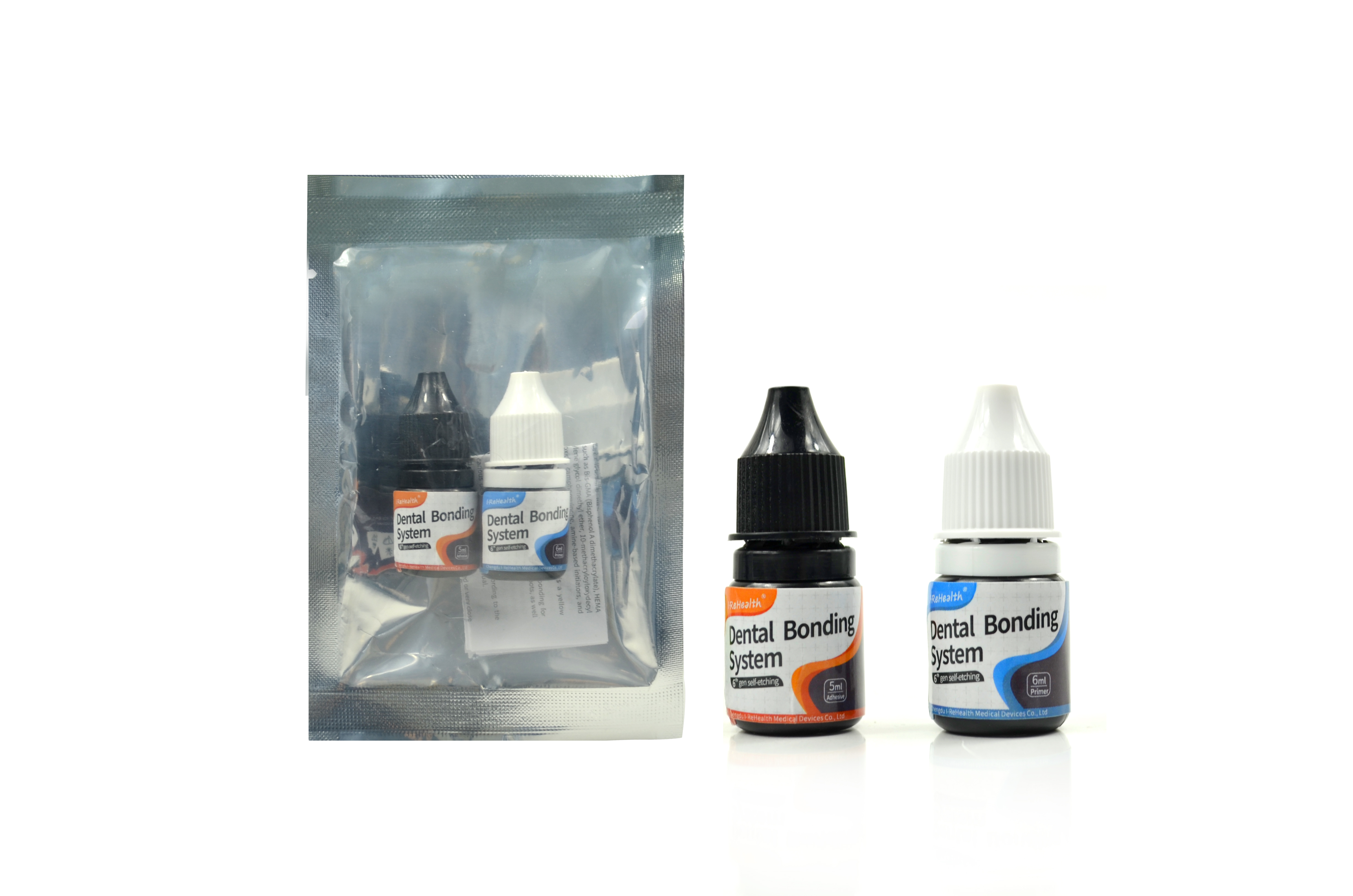 【Ingredients】 Dental Bonding System consists of primer and adhesive, the former is an orange liquid and the later a light yellow transparent solution, mainly composed of monomers such as Bis-GMA (Bisphenol A dimethacrylate), HEMA (2-hydroxyethyl methacrylate), dimethacrylate of ethylene glycol dimethyl ether, 10-methacryloyloxydecyl dihydrogen phosphate (MDP), and fillers like silica dioxide, camphorquinone, amine-based initiators,and coloring agents.