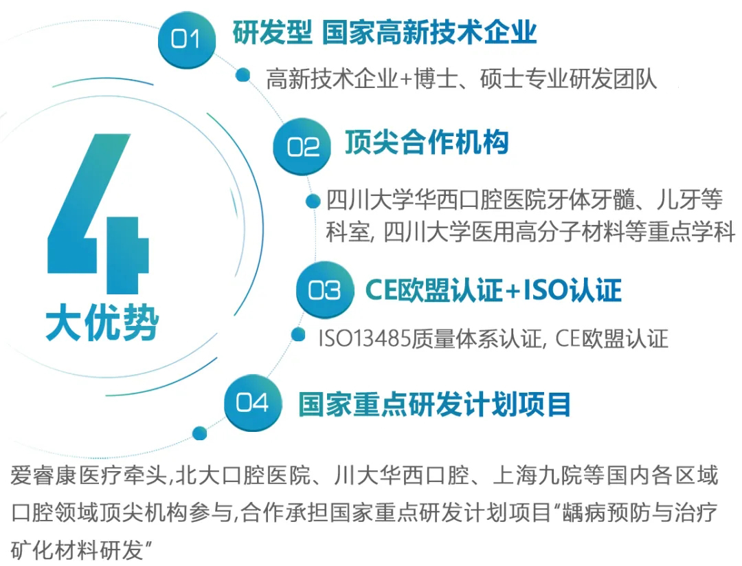 爱睿康医疗新品上市:专业守护,从“齿”开始!发表时间:2025-04-15 16:20 ·爱睿康新品上市 关于爱睿康 爱睿康医疗旗下全资子公司成都爱睿康乐医疗器械有限公司是一家专注口腔医用材料和医疗器械产品研发生产销售的国家高新技术企业。爱睿康医疗品牌由国家杰青、国家优青、四川省杰青李建树教授(四川大学华西口腔医院双聘教授)创立。 公司拥有国际前沿的研发和转化能力,博士、硕士级专业研发团队,拥有丰富完整的口腔领域产品线“防”-“治”-“美”-“修”,一站式为您解决口腔健康问题。 ![]() 01 根管治疗新突破 ——解决临床三大核心痛点 ROOT CANAL TREATMENT 在根管治疗领域,临床医生们常面临: ①预备效率低:传统润滑剂清洁不彻底,延长操作时间 ②消毒不持久:普通消毒剂无法持续抑制根尖周感染 新品:根管治疗产品 爱睿康医疗创新推出3款根管治疗产品,实现: 01 EDTA根管润滑凝胶 产品中的功效成分乙二胺四乙酸(EDTA)对钙离子具有螯合作用,可使牙本质中的无机成分软化溶解,使机械切削形成的玷污层软化更易脱落去除,从而开放牙本质小管口。同时,产品中含有润滑成分,可润滑根管壁和根管锉针,使得根管锉针在狭窄、弯曲的根管内切削时不易断裂。而且本产品还含有消毒杀菌成分(过氧化脲),可在根管预备切削的同时起到抑制杀灭病菌、防止病菌和感染深入的作用,也能在牙本质小管开放的第一时间对牙本质小管和根管侧支进行消毒杀菌。 国家二类医疗器械 ①含10%过氧化脲,器械、化学预备和消毒杀菌同步进行 ②水溶性凝胶质地,轻松去除残屑,提升治疗效率 ③有效去除根管壁玷污层及牙本质碎屑 ![]() 02 氢氧化钙根管消毒剂(单组份) 氢氧化钙微溶于水,呈强碱性,可部分解离成钙离子和氢氧根离子,因此绝大部分根管内的致病菌不能生存于氢氧化钙形成的强碱性环境中,感染根管中的细菌在直接接触氢氧化钙后很短时间内被消除。 国家二类医疗器械 ①水溶性糊剂,操作方便 ②强杀菌+持久抑菌,严守根尖健康 ③氢氧化钙含量≥95%,抑菌力卓越 ![]() 03 氢氧化钙根管消毒剂(双组份) 国家二类医疗器械 ①粉液调和, 操作简单 ②导入方便, 清除容易 ③不含酚类更安全 ![]() 02 口腔护理新纪元 ——破解家庭护齿难题